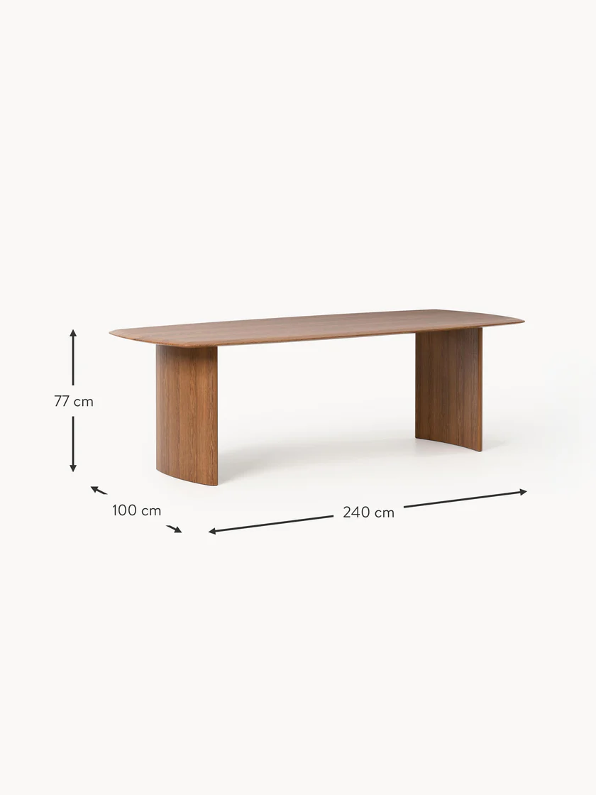 De Ardenza eettafel straalt verfijnde kracht uit dankzij zijn robuuste materialen en opvallend silhouet. De combinatie van sterke lijnen en subtiel afgeronde hoeken geeft deze tafel een evenwichtige uitstraling: indrukwekkend en toch zacht. Het donker eikenhouten oppervlak voegt warmte en karakter toe aan elke eetkamer, terwijl het ruime formaat voldoende plaats biedt voor grote gezelschappen tot 10 personen.