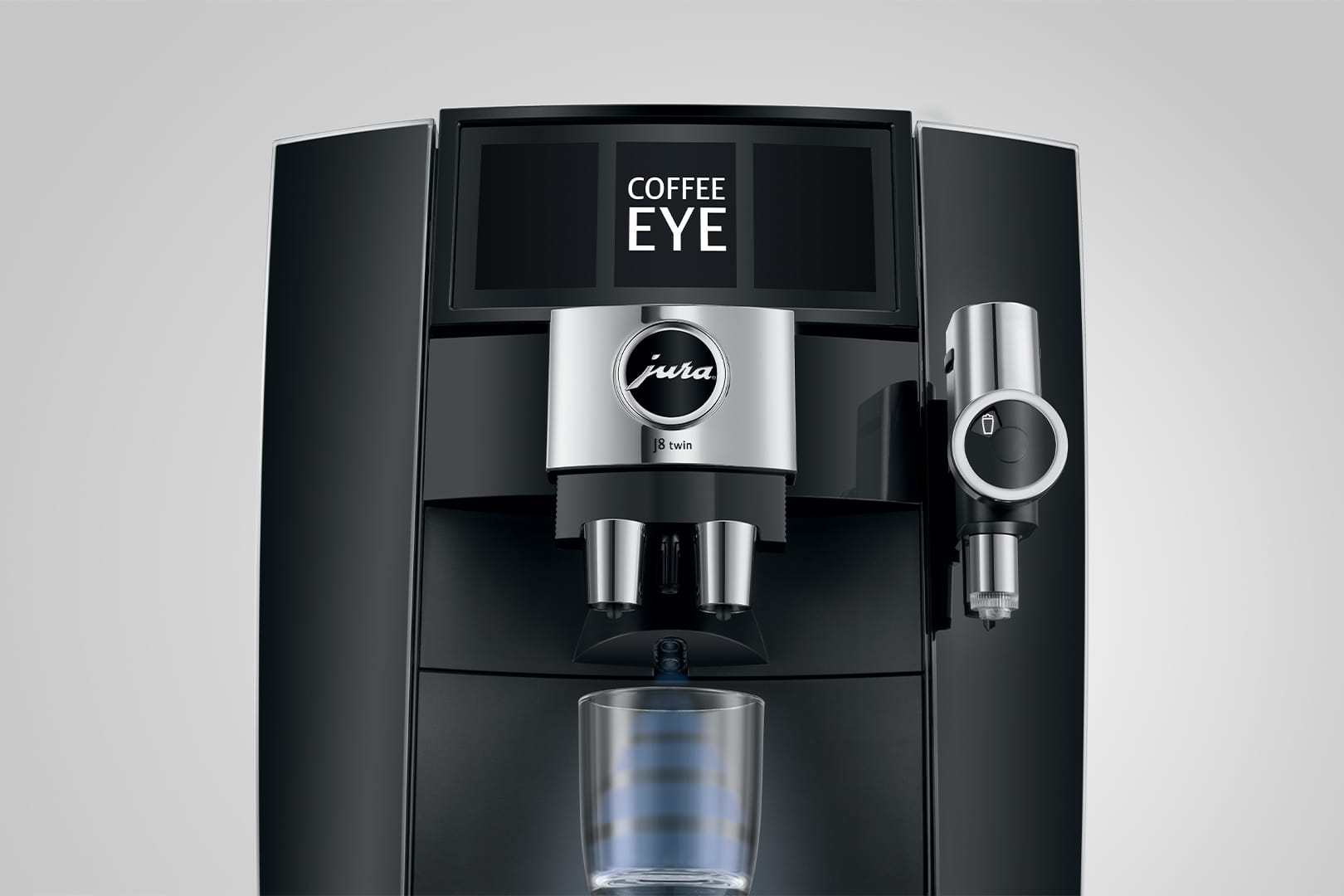 Via het Panorama Coffee Panel kunnen alle voordelen van de J8 twin intuïtief worden benut. De stringente en logische bedieningsfilosofie is volledig zelfverklarend. De Easy Mode biedt dankzij de schuifregelaars maximale flexibiliteit bij het aanpassen van de specialiteiten aan de favoriete kopjes. Assistentiesystemen maken de bediening nog eenvoudiger. De aromacontrole zorgt voor de juiste maalfijnheid. De intelligente kopjessensor, het Coffee Eye, zorgt ervoor dat de kopjes altijd in overeenstemming met de geselecteerde specialiteit onder de juiste uitloop worden geplaatst. Het spreekt voor zich dat ook reiniging en onderhoud met één druk op de knop uitgevoerd kunnen worden.